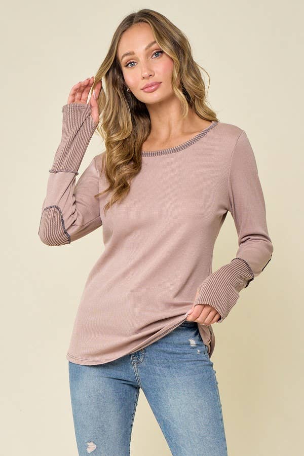 This long sleeves top is made of a soft thermo material. Has a ribbed cuffs contrast, a ribbed patchwork detail at elbow and a round neckline.