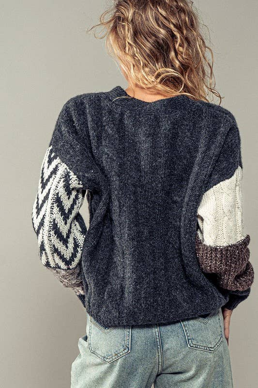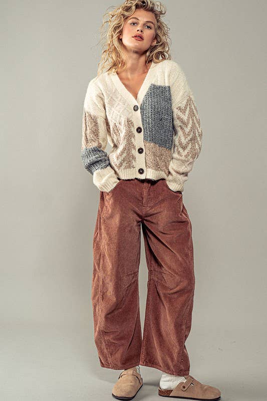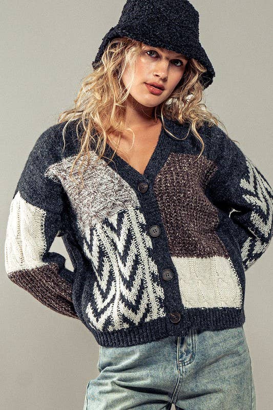This statement cardigan features a patchwork of cable knit and geometric patterns, a flattering V-neckline, and a button-front closure for versatile styling. Ribbed trim and bold colorblock sections add a modern touch, making it perfect for layering with jeans or skirts in cool weather.