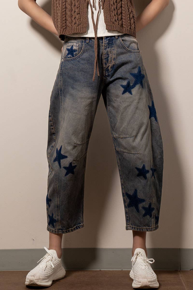 Slight Acid Wash Barrel Jeans with Star Embroidery and Inseam Stitch Detail S-L:2-2-2 88% COTTON 12% POLYESTER CHINA